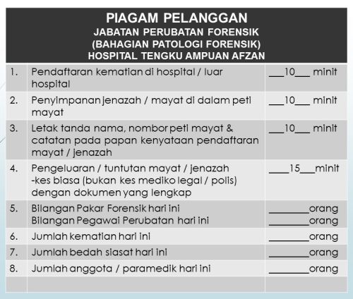- Menyediakan kemudahan premis kepada pasukan TOP hospital untuk menjalankan prosedur perolehan tisu bagi kes Brought In Death dan Death In Department